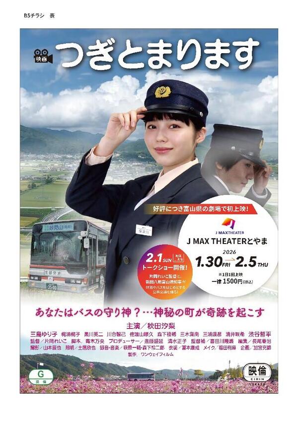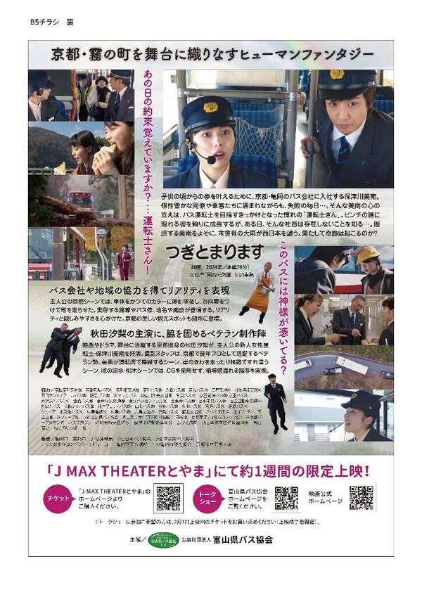 富山県バス協会では、バス運転士を目指す女性を題材にした映画「つぎとまります」を下記の日程で限定上映します。